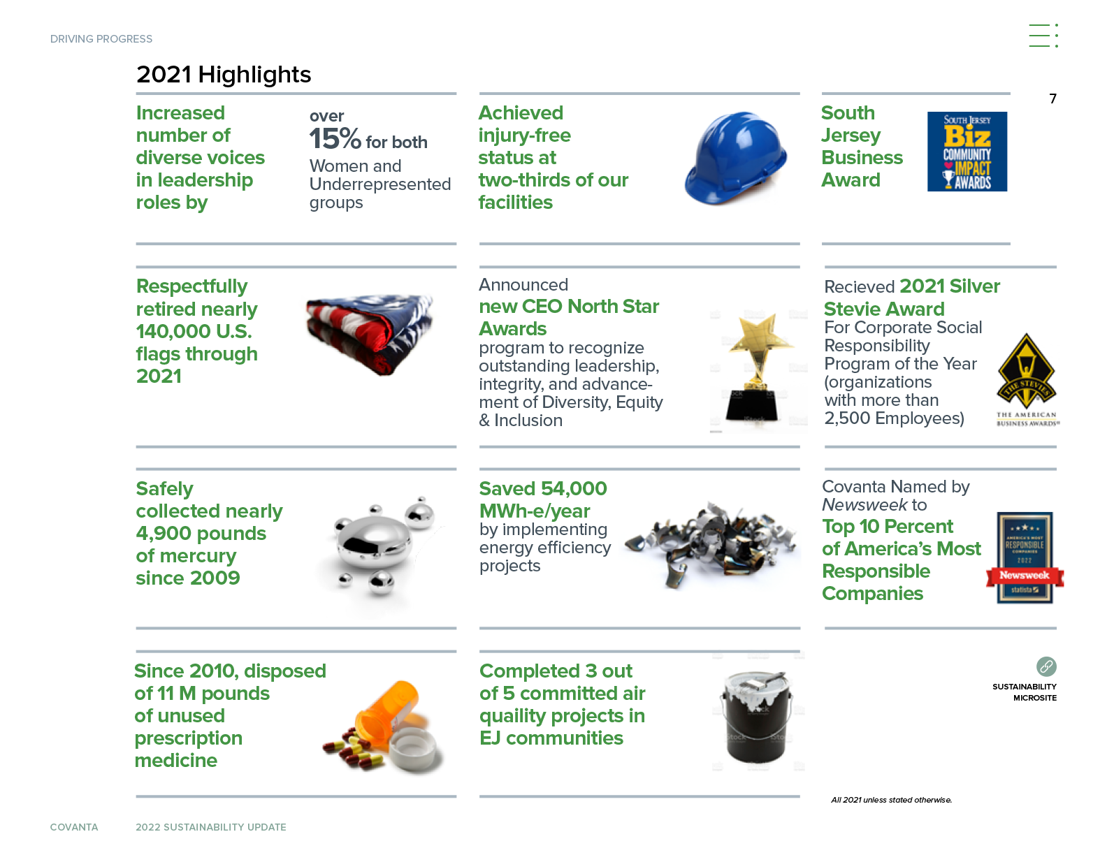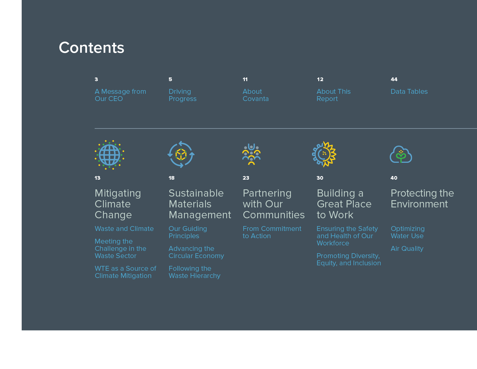As a company in the waste management industry, Covanta (now ReWorld) had a uniquely complex sustainability story to tell. The report is an essential tool for Covanta communicators whose jobs include explaining how waste-to-energy fits into the total waste management equation.